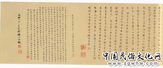 此卷今不知流落何所?元五大僧字卷与史忠《杂画册》二种,后皆归顾文彬,《过云楼书画记》著录。元人书法,除五大僧字卷外,黄丕烈还从陈鱣处购得龚璛《静春堂诗序》、王袆《寓斋记》双卷。此两卷据《须静斋云烟过眼录》记载,嘉庆十九年(1814)甲戌十二月一日,陈鳣曾携来苏州,请潘奕隽赏鉴: